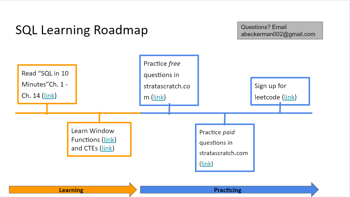 In this post, I provide a roadmap for learning SQL. After spending countless years grudgingly combing through many SQL learning resources I’m excited to share with you what I think is the best way to learn SQL. I should also note I learned SQL in the context of landing a data analytics supporting business type role (marketing analytics/sales strategy), so if you’re interested in getting into that field this post will be especially helpful!